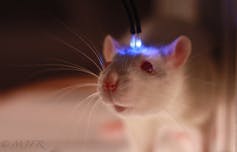 Rat receiving optogenetic stimulation of the brain using laser light to produce focused and compulsive reward-seeking. Mike Robinson, Author provided (No reuse)